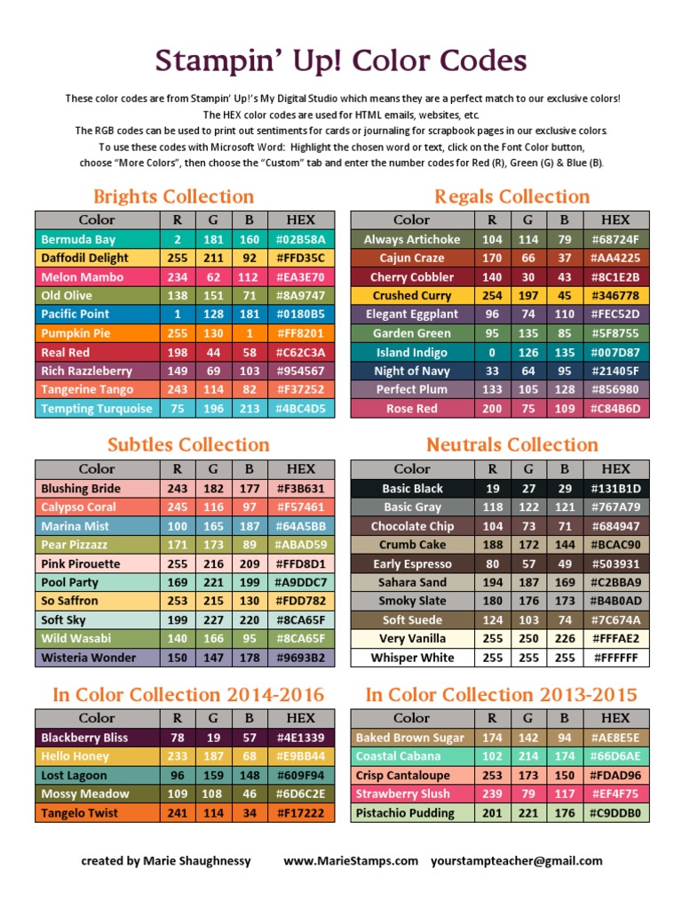 Rgb Hex Color Codes 2016 2017 Pdf Stampin Up Stampin Hex Color Codes. Home›conversion›color conversion› hex to rgb. So you just have to take each pair of hex digits and convert them to decimal. And if you want to convert rgb to hex color then copy rgb color in this format rgb(255, 255, 255) and insert it into the second field and copy the hex color from the first field. Convert hex color codes to rgb html format for use in web design and css. Free online hexadecimal color to rgb color converter. The other note is that colors.hex2color only accepts valid hex color a hex value is just rgb numbers represented in hexadecimal. Get the 2 middle digits of the hex color code and convert to decimal value to get the green color level. What does this hex to rgb converter do? Rgb(0, 100, 100) color preview. Also converts hex to rgba. Convert hex color values to rgb & vice versa. Html element samples are also shown below the. Return colors.rgb2hex(1.0*x/255 for x in rgb_tuple). It takes input in the form of a hex color code value and converts that value to a rgb value that can be used to specify color in photo editing. There are many great hex to rgb color converters out there, but usually they give you result in three separate fields (r, g & b), which is annoying because 99% of times when i need an rgb value from hex, i need to paste it to some css rule.
