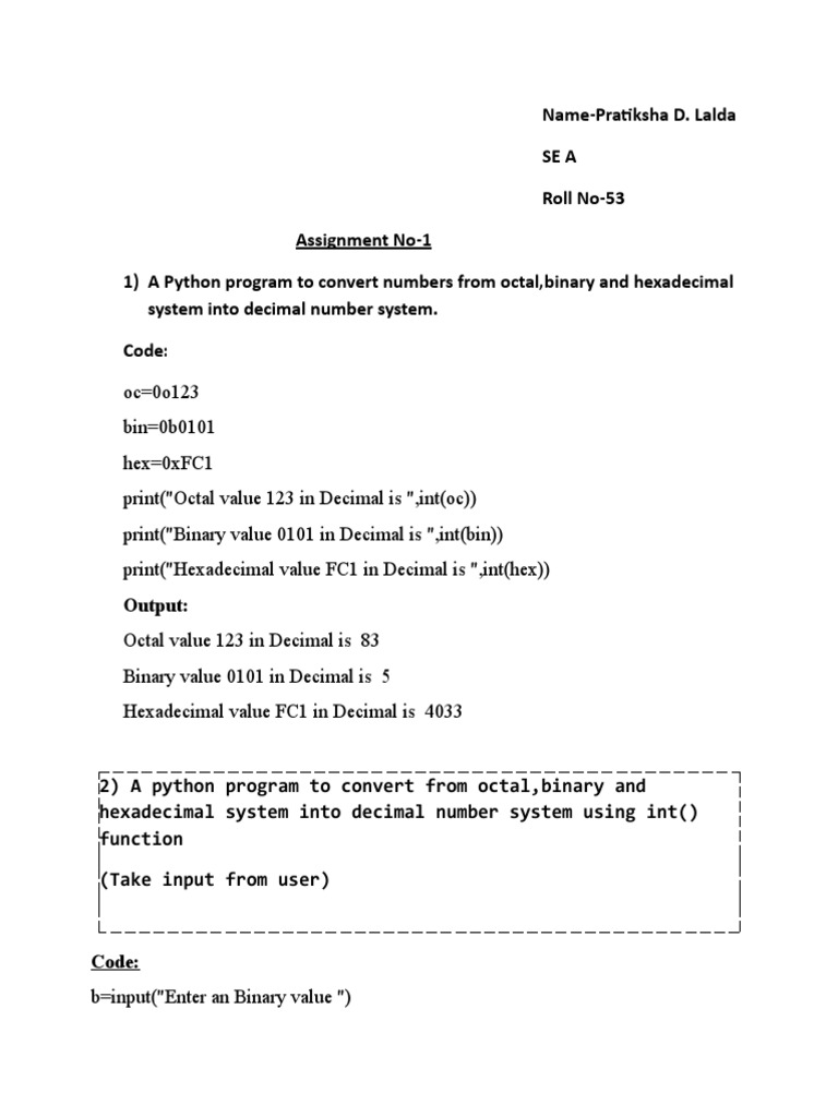 Which function can i use to see the result in those different binaries? We can also pass an object to hex() function, in that case the object must have __index__() function defined that returns integer. First, before we can do any binary manipulation at all, convert to int (i presume this is in a string format, not as a literal) Convert hex to binary, 42 digits and leading zeros? Hexstr must contain an even number of hexadecimal digits (which can be upper or lower case), otherwise an error exception is. The input integer argument can be in any base such as binary. # conversion of hex string. As i come across this again and again: If hexdec == 'x' now enter any number in hexadecimal and then press enter key to convert the same number in binary form, that is in 0 and 1 form as shown here 11111111 hex = {0:x}.format(i) # hexadecimal: Creating transaction to send coins from a to b. Go from zero to hero. In this article you will learn how to use binary numbers in python, how to convert them to decimals and how to do bitwise operations on them. 1, 23, 3493 # decimal integers 01, 027, 06645 # octal integers 0x1, 0x17, 0xda5 # hexadecimal integers. How do you turn a hex string like c3a4c3b6c3bc into a nice binary string like this: Can i just use hex(number) in python? Is mathematica writing the hex file as 2000 or 0x2000? The number systems refer to the number of symbols or characters used to represent any numerical value. This function is the inverse of b2a_hex(). We have several direct ways to accomplish this goal, without hacks using slices. # python code to demonstrate. Which function can i use to see the result in those different binaries? Python hex() function is used to convert an integer to a lowercase hexadecimal string prefixed with 0x. If x is not a python int object, it has to define an __index__() method that returns an integer. Print 0122 print 0x9ff print 0b1111. The returned string always starts with the prefix 0x. Python hex() is an inbuilt function that is used to convert any integer number ( in base 10) to the corresponding hexadecimal number. This python quick tips video covers the python bin function. Return the hexadecimal representation of the binary data. Convert 255 into hexadecimal value the hex() function converts the specified number into a hexadecimal value. So how would it be printed a binary as a integer16 or as a integer32?