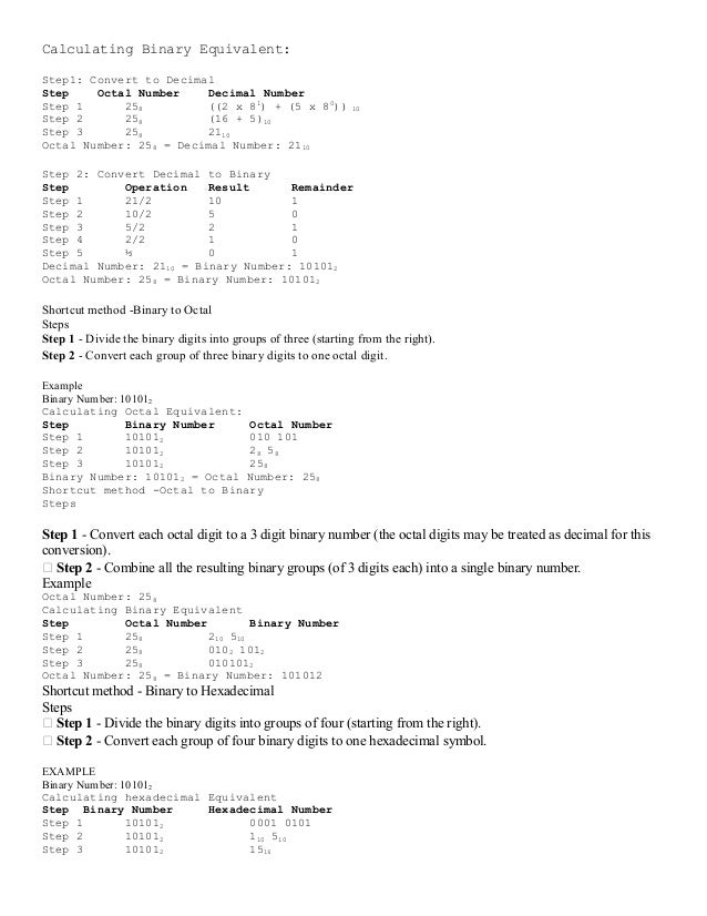 How To Convert Binary To Octal Number 11 Steps With Pictures. Number conversion table the below is the conversion table for decimal, binary, hex & octal number systems. The equivalent binary number of octal number are as given below −. Firstly we need to convert hexadecimal into its equivalent decimal number then decimal to for each given hexadecimal number digit, write the equivalent binary number. The decimal numbering system has a radix of 10. Octal numerals can be made from binary numerals by grouping consecutive binary digits into groups of three (starting from the right). A denary (decimal) number can be expressed as. Hexadecimal equivalent of decimal number is obtained by dividing the number by 16 and collecting the remainders in answer: Electronics tutorial about hexadecimal numbers, the hexadecimal numbering system and converting binary to hexadecimal numbers and back again. Octal to decimal conversion is obtained by multiplying 8 to the power of base index along with the value at that index position. This number systems tutorial explains how to do a hexadecimal to octal conversion. 167 269 просмотров 167 тыс. In mathematics and computing, the hexadecimal (also base 16 or hex) numeral system is a positional numeral system that represents numbers using a radix (base) of 16. Conversion of hexadecimal to octal cannot be done directly. Octal number system is similar to hexadecimal number system. If any of the binary equivalents are less than 4 digits, add 0's to the.