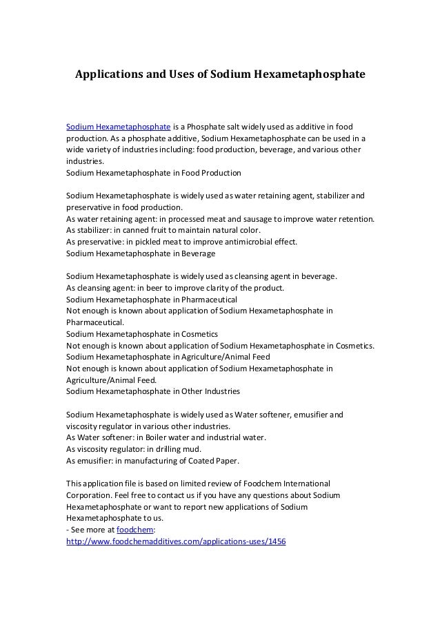 Sodium Hexametaphosphate Shmp. Napo3), of which the hexamer is one, and is usually the compound referred to by this name. It is a hexamer comprising of a chain of napo3 the other name of this chemical composition is also known as calgon. Generally, its purpose in food is as a texturizer. Sodium hexametaphosphate is a chemical compound comprising of a blend of polymeric metaphosphates. It is also known as polyvinylidene sodium, sodium multiple metaphosphate, sodium metaphosphate vitreous body, and graham salt or calgon. The european food additive number for it is e452i. Sodium hexametaphosphate of commerce is typically a mixture of metaphosphates (empirical formula: Sodium hexametaphosphate is a sequestrant that binds with calcium ions. This site is using cookies under cookie policy. Sodium hexametaphosphate is a kind of sodium metaphosphate polymers. Sodium hexametaphosphate, also known as its abbreviation shmp, a polyphosphate commonly used in dairy products, sausage, seafood, meat processing, toothpaste, and also in water treatment. Sodium hexametaphosphate (shmp) is known as we're in the know. Sodium hexametaphosphate (shmp) is a salt of composition na6(po3)6. The sodium hexametaphosphate formula is (napo3)6. You can specify conditions of storing and accessing cookies in your browser.