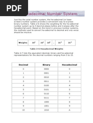 Hexadecimal Wikipedia. 2 * 8 + 9 * 8 + 4 * 8 (comment: Hex numbers are often followed by a lowercase h to indicate they are in hex (example: Hexadecimal number system is not used by a digital system. In mathematics and computing, the hexadecimal (also base 16 or hex) numeral system is a positional numeral system that represents numbers using a radix (base) of 16. Following are the characteristics of a hexadecimal number system. Uses the 16 numerals 0, 1, 2, 3, 4, 5, 6, 7, 8, 9, a, b, c, d, e, and f. Following hexadecimal addition table will help you greatly to handle hexadecimal addition. To use this table, simply follow the directions used in this example − add a16 and 516. The hexadecimal number system is for our convenience to long binary strings in a short and concise form. Binary number system to hexadecimal number system e.g. What we did here is line with step a e.g. Counting in hexadecimal counting in hexadecimal is similar to the other number systems. Download number system pdf to learn about the various classification of number system, different types of number system along with simple examples. A number system based on 16 values (called base 16), which is explained in this appendix. The hexadecimal or simply hex numbering system uses the base of 16 system and are a popular choice for representing long binary values because their format is quite compact and much easier to understand compared to the long binary strings of 1's and 0's.