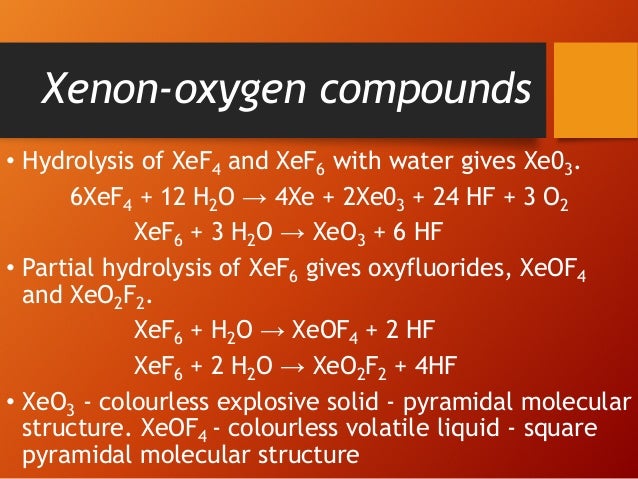 Group 18 Elements Noble Gases Ppt Video Online Download. These solutions are stable, but they are strongly oxidizing, rapidly liberating chlorine. Both xef4 and xef6 hydrolyze in water to produce aqueous solutions of nonvolatile xeo3 molecules. Xenon hexafluoride on partial hydrolysis and oxidation state of xe is??? All known are exergonic and stable at normal temperatures. It is one of the three binary fluorides of xenon, the other two being xef2 and xef4. Xenon hexafluoroplatinate is the product of the reaction of platinum hexafluoride and xenon, in an experiment that proved the chemical reactivity of the noble gases. Xenon hexafluoride is a noble gas compound with the formula xef6 and the highest of the three known binary fluorides of xenon, the other two being xef2 and xef4. Xef6 is the strongest fluorinating agent of the series. This experiment was performed by neil bartlett at the university of british columbia. Sulfur hexafluoride is present in the air mainly from accidental leaks in electrical equipment containing sulfur hexafluoride. Xenon hexafluoride is a noble gas compound with the formula xef6. Sulfur hexafluoride is an important commercial chemical that is used as a gas insulator in electrical equipment and in medical, space and environmental research. All known are exergonic and stable at normal temperatures. Xenon hexafluoride (xef6) it is prepared by heating a mixture of xenon and fluorine in the ration 1:20 at 300 degree celsius and 60 atm in a nicked vessel. Rate constants can not be estimated for this structure!